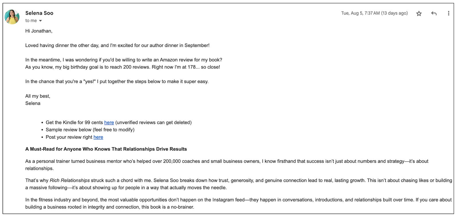 Selena Soo sent me a smart review request last week for Rich Relationships that I'll likely adapt. Here's what made it work: