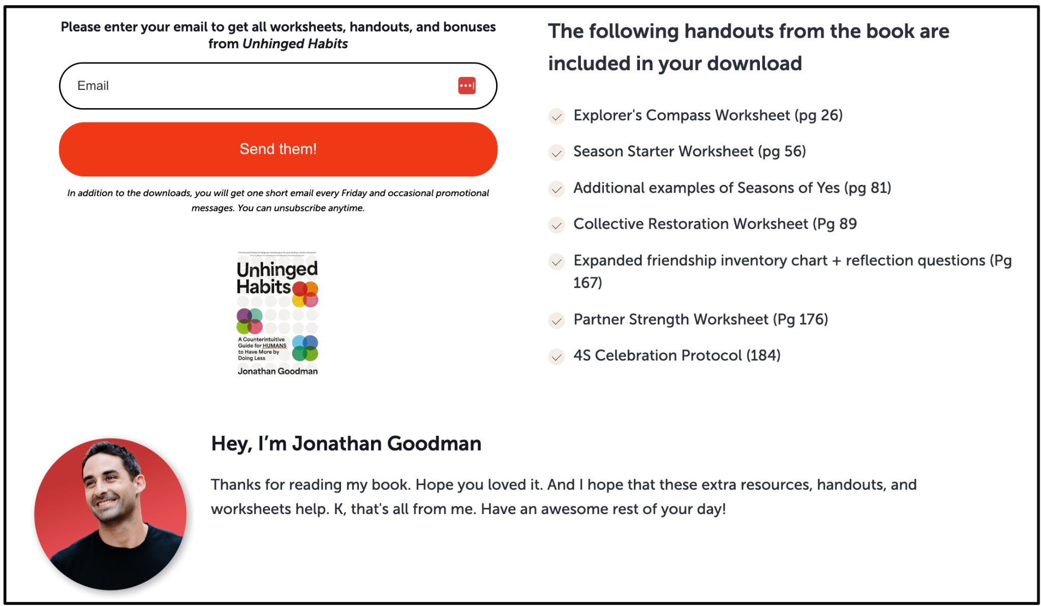 This page shows the book, confirms the downloads, and adds personality.