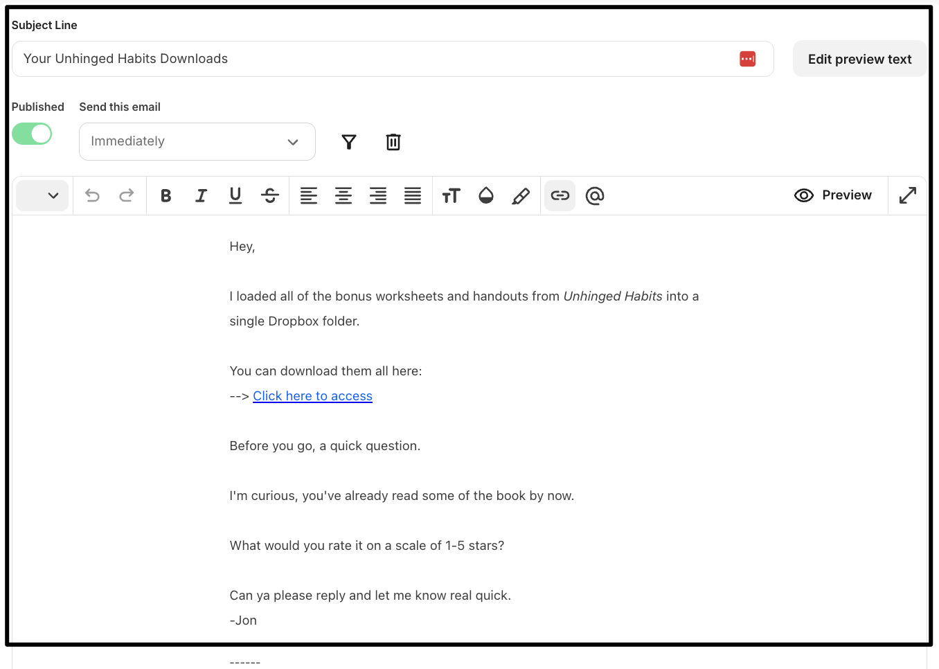 I use Kit.com for email management (here’s a big feature they just published on me!). The embedded form triggers an automation that: