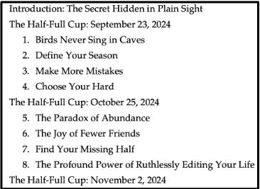 I then rewrote anything that didn’t get an A until it did. Here’s the final table of contents for Unhinged Habits: