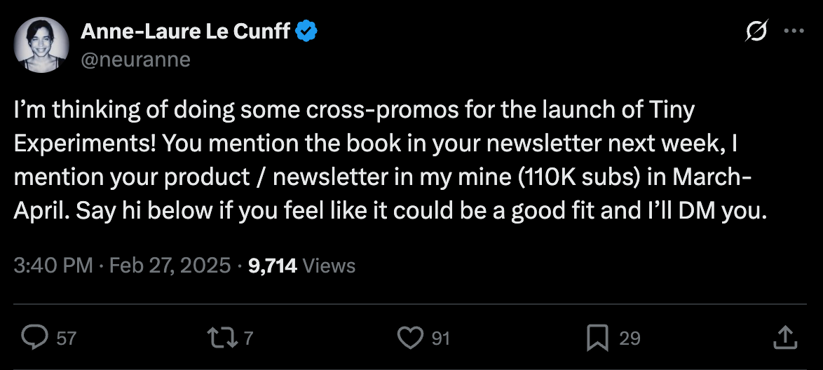 I’m going to write the email in advance for each newsletter. Instead of asking if they’ll let me do it, I’ll just send it to them already finished in their style and formatting. The easier you make it for the other person to say yes, the better the likelihood they will.